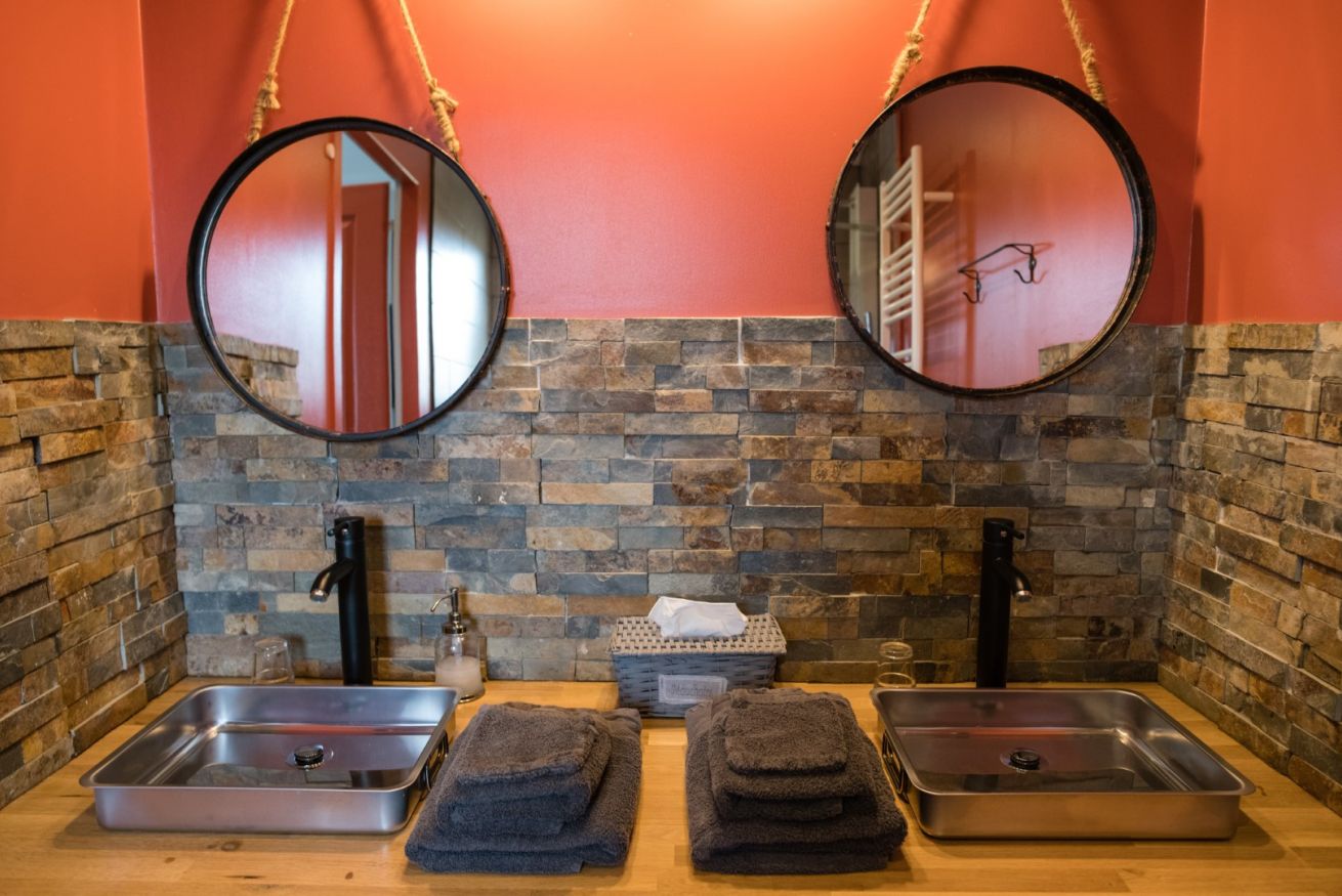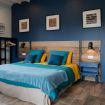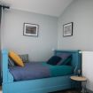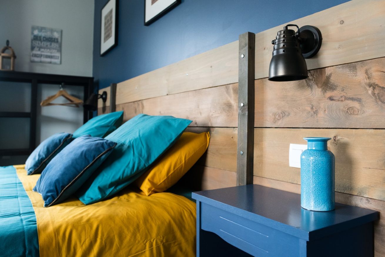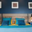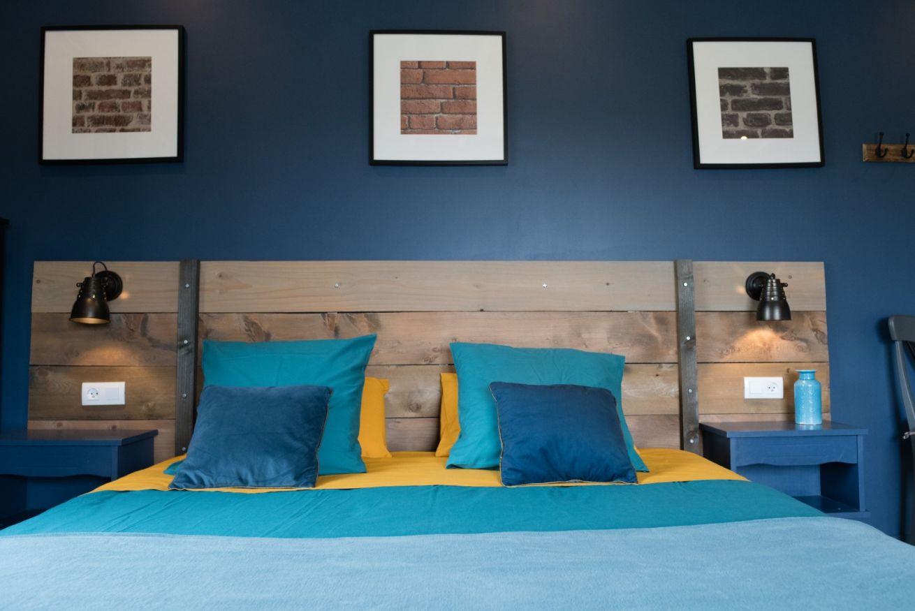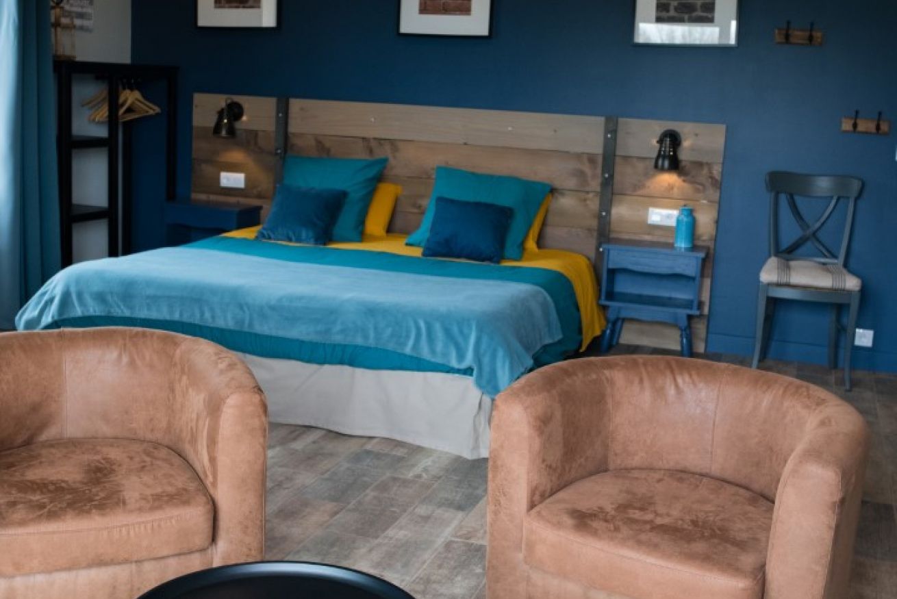 Place aux bleus intenses et au mélange des genres pour cette chambre à la décoration atypique. Comme toutes nos chambres, elle garde un esprit campagne avec son lit bateau à rouleaux ancien relooké et le bois comme matière dominante. Mais quand on y ajoute une tête de lit brute de coffrage, un effet plancher bois pour le sol, des fauteuils cabriolet style vintage, des racks métalliques, une touche de briques et des objets détournés dans la décoration, cela détonne et lui confèrent une ambiance industrielle chaleureuse. Reconnectez lui donc la nature en accédant à votre terrasse et découvrez votre vue sur le château de Serrières qui domine la colline et la forêt.