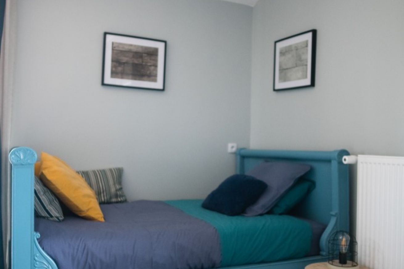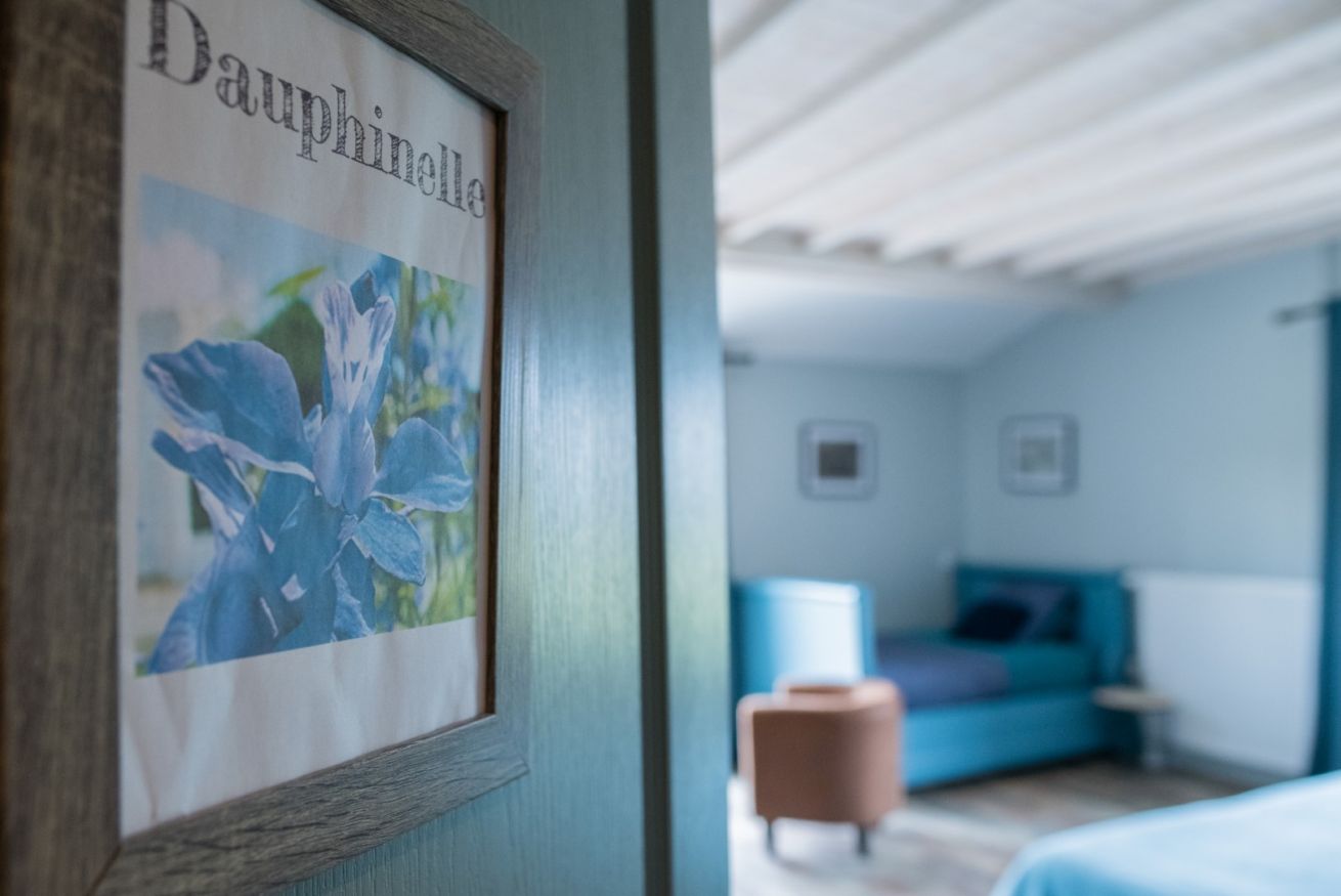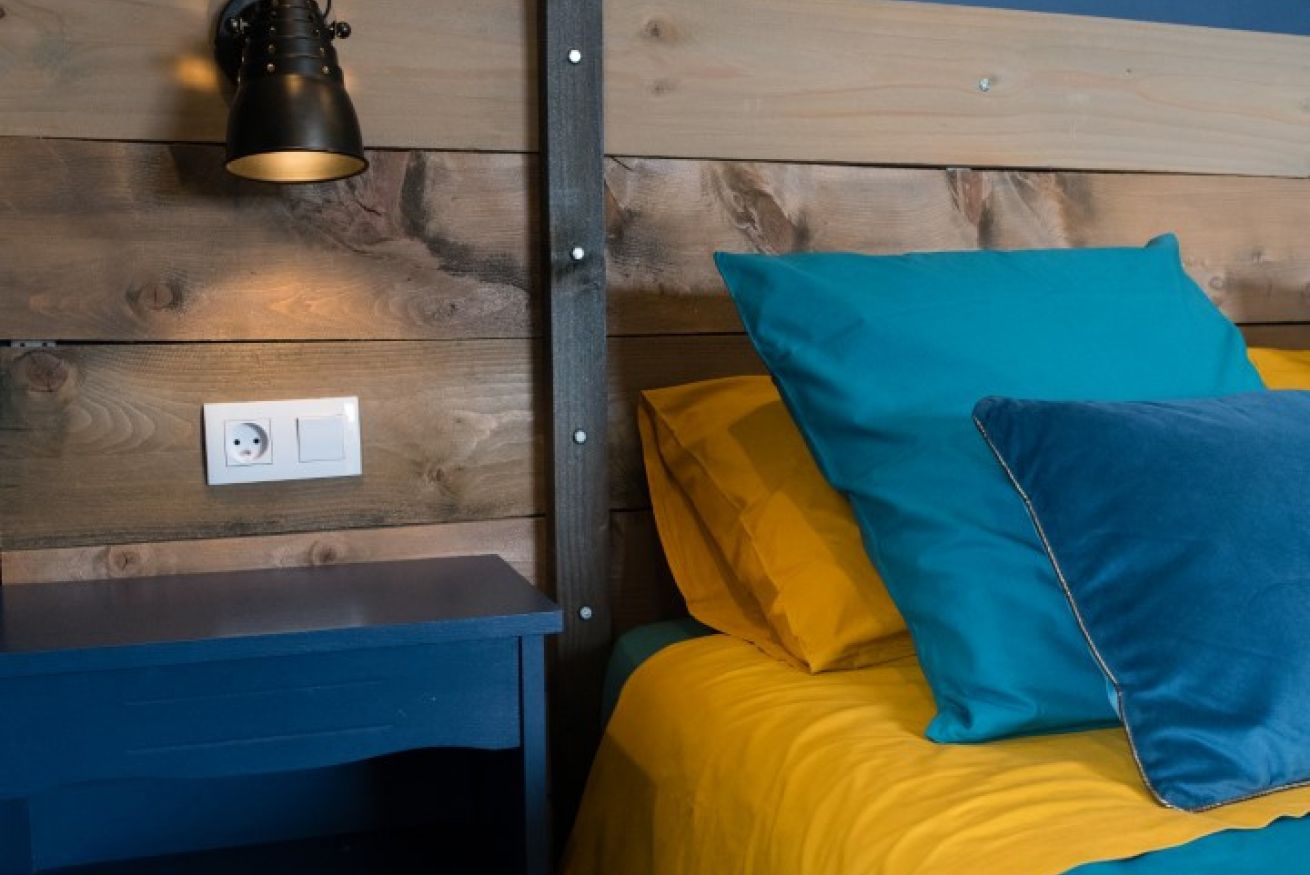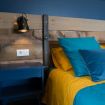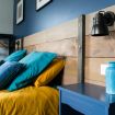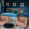Place aux bleus intenses et au mélange des genres pour cette chambre à la décoration atypique. Comme toutes nos chambres, elle garde un esprit campagne avec son lit bateau à rouleaux ancien relooké et le bois comme matière dominante. Mais quand on y ajoute une tête de lit brute de coffrage, un effet plancher bois pour le sol, des fauteuils cabriolet style vintage, des racks métalliques, une touche de briques et des objets détournés dans la décoration, cela détonne et lui confèrent une ambiance industrielle chaleureuse. Reconnectez lui donc la nature en accédant à votre terrasse et découvrez votre vue sur le château de Serrières qui domine la colline et la forêt.
