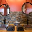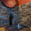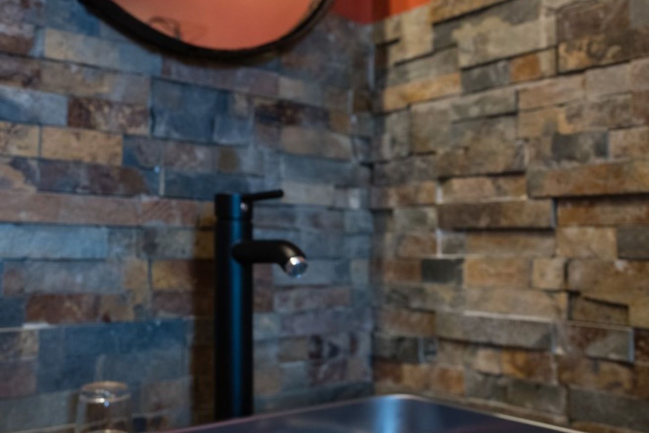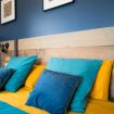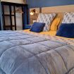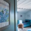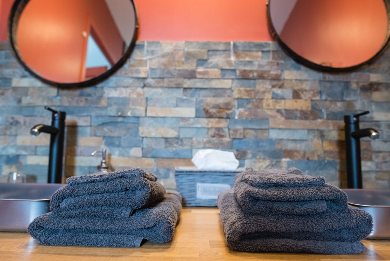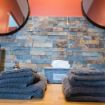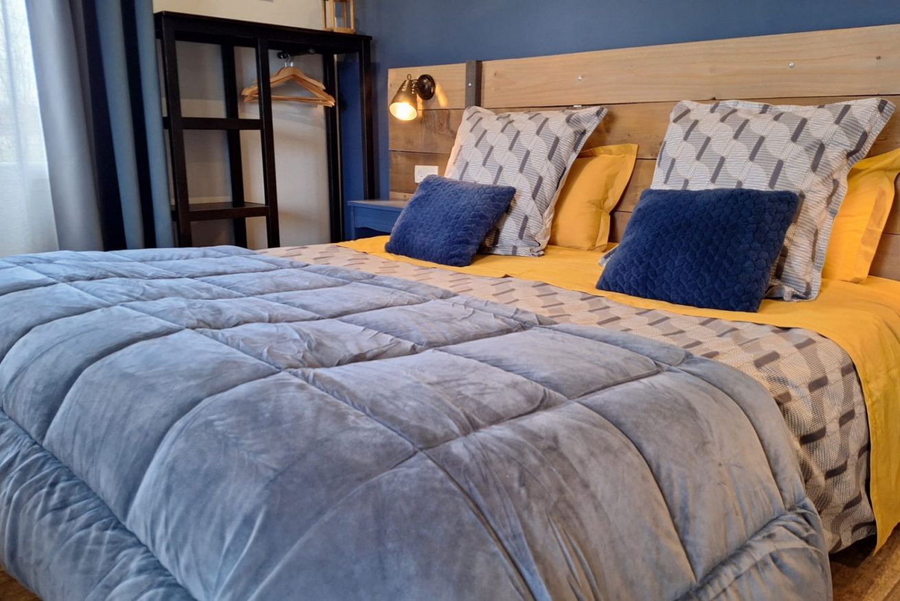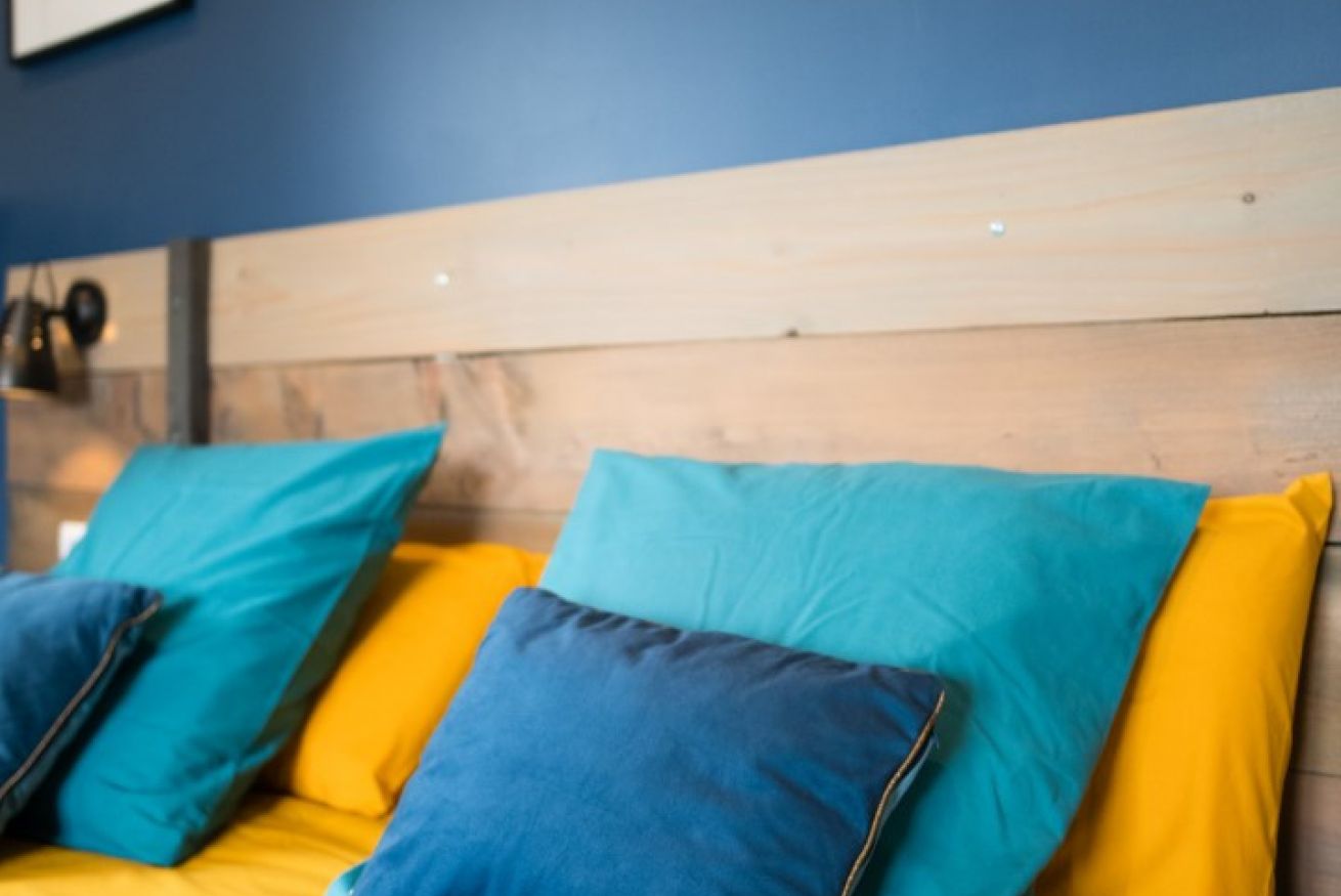 Place aux bleus intenses et au mélange des genres pour cette chambre à la décoration atypique. Comme toutes nos chambres, elle garde un esprit campagne avec son lit bateau à rouleaux ancien relooké et le bois comme matière dominante. Mais quand on y ajoute une tête de lit brute de coffrage, un effet plancher bois pour le sol, des fauteuils cabriolet style vintage, des racks métalliques, une touche de briques et des objets détournés dans la décoration, cela détonne et lui confèrent une ambiance industrielle chaleureuse. Reconnectez lui donc la nature en accédant à votre terrasse et découvrez votre vue sur le château de Serrières qui domine la colline et la forêt.