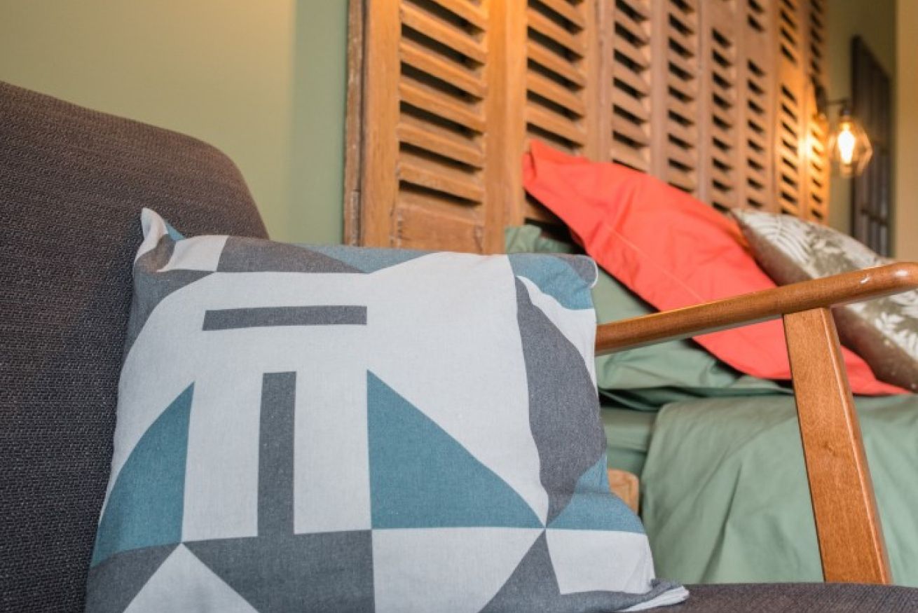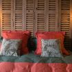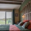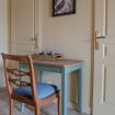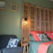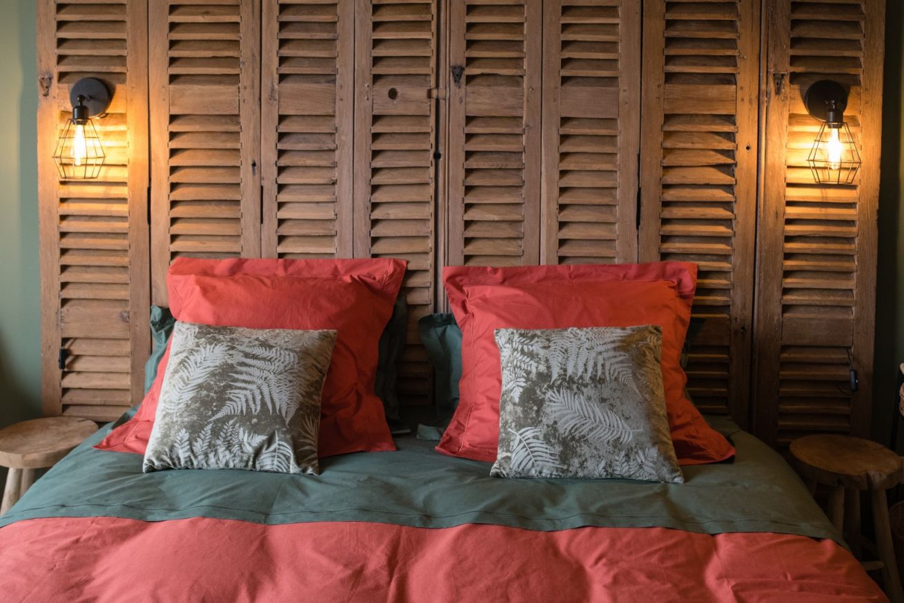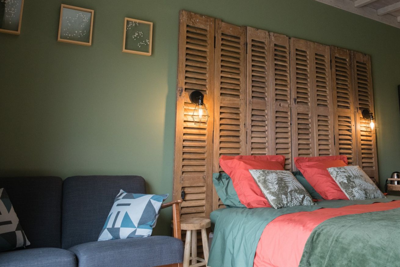 Si vous aimez vous aussi les matières et couleurs naturelles, la chambre vulnéraire vous plaira à coup sûr ! Le vert profond apporte la touche végétale quand l'ocre jaune vous ramène à la terre. Les persiennes en chêne qui forment la tête de lit, le bois brut de la bonnetière chinée, la patine de la table ancienne et l'ocre rouge des draps accentuent cet effet pleine nature. Respirez un grand coup sur votre terrasse privative face à la forêt et au château de Serrières !